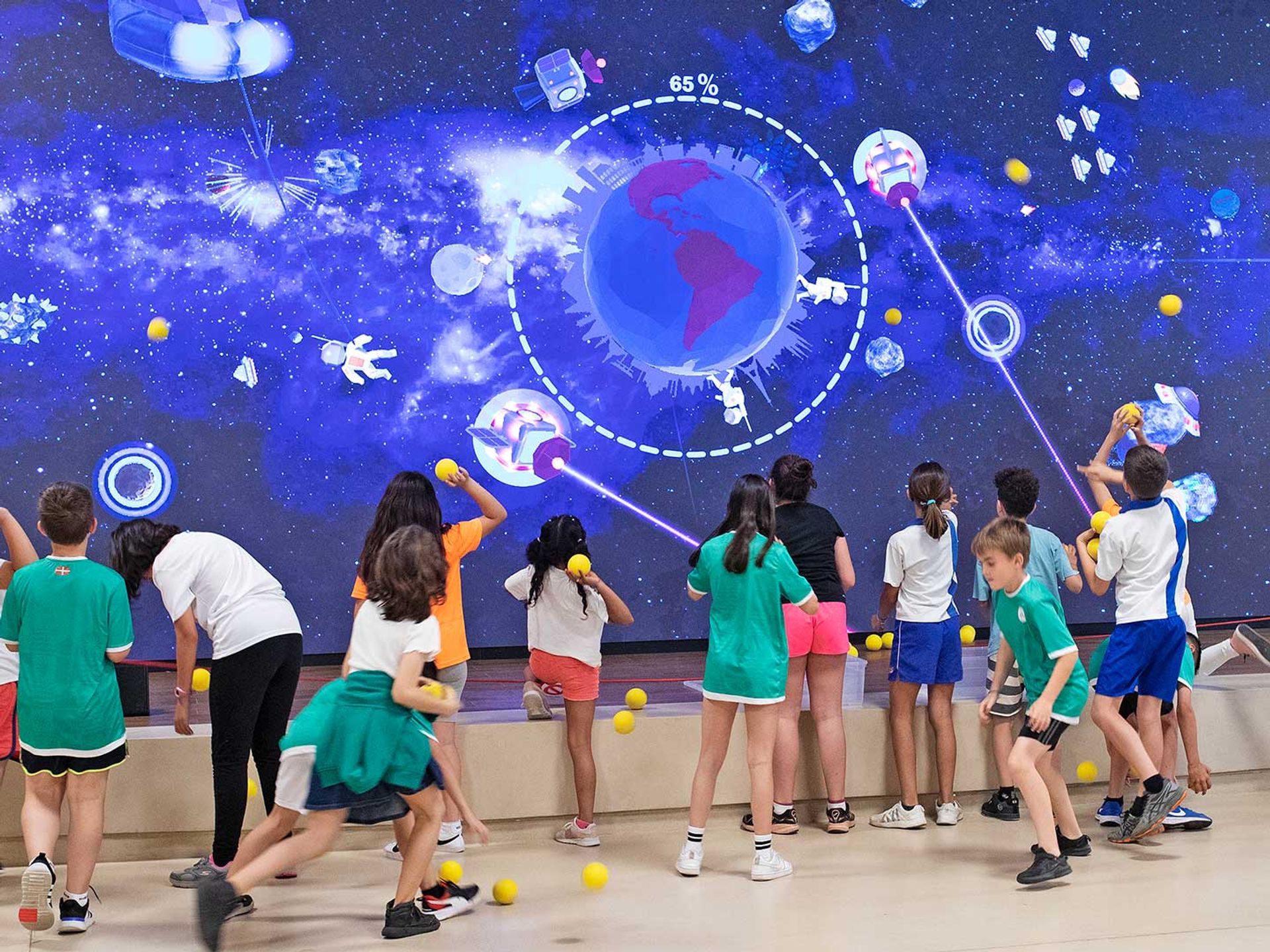 En el proyecto, se han diseñado experiencias específicas asociadas a cada uno de los retos, en forma de juegos distribuidos por el espacio, conceptualizados para superarse en grupo, como los retos medioambientales.